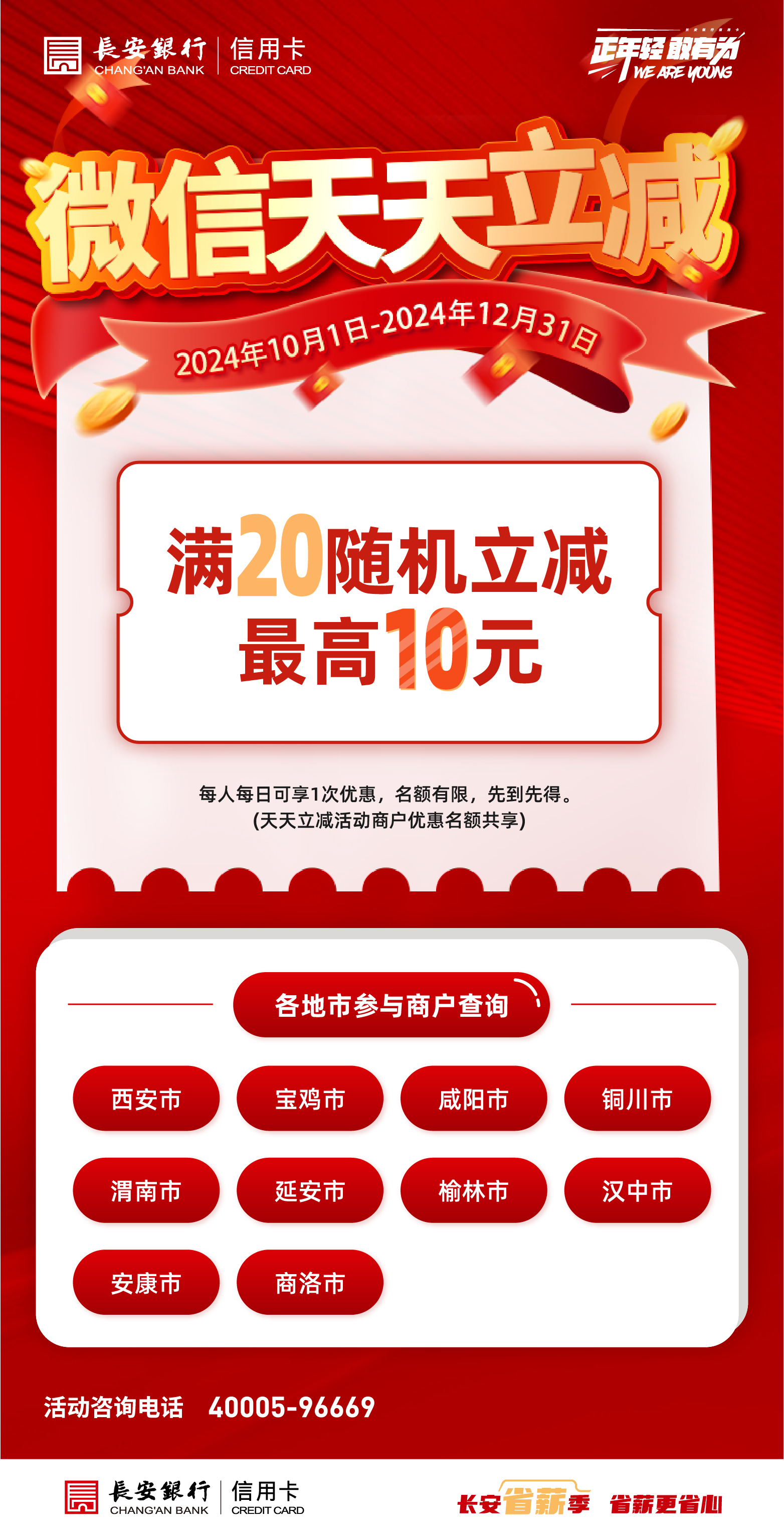 长安银行信用卡持卡客户在指定商户(DQ、肯德基、斑马悦活、唐久便利、曹操专车(微信小程序/app等)使用微信支付,即有机会参与满20元随机立减最高10元活动。活动名额有限,先到先得,每人每日可享1次优惠。