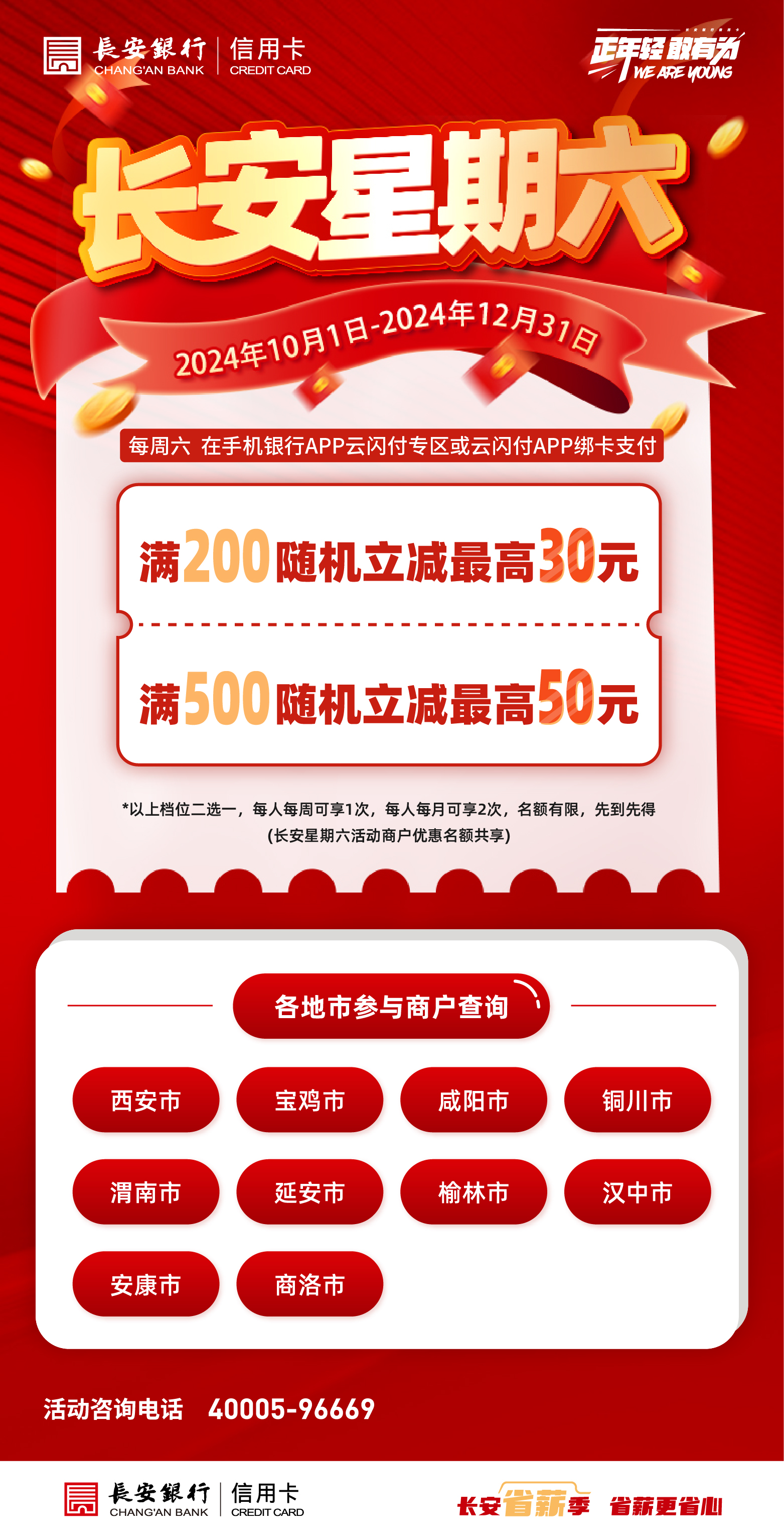 活动期间,长安银行信用卡持卡客户在指定商户(华润万家部分门店、孩子王、乐友、人人乐等)使用长安银行手机银行APP云闪付专区或云闪付APP购物消费,有机会参与单笔满200元随机立减最高30元活动、满500元随机立减最高50元活动,以上档位2选1,每人每周可享1次满减优惠,每人每月可享2次满减优惠。