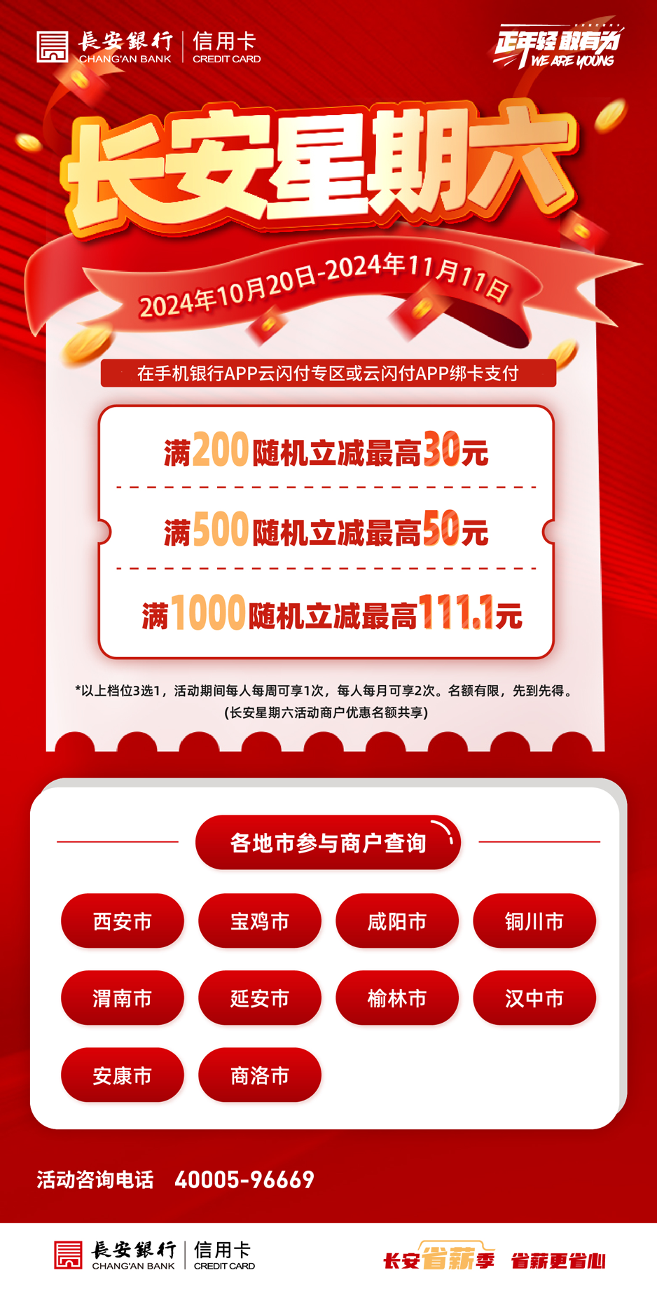活动期间,长安银行信用卡持卡客户在指定商户(华润万家部分门店、孩子王、乐友、人人乐等)使用长安银行手机银行APP云闪付专区或云闪付APP购物消费,有机会参与单笔满200元随机立减最高30元活动、满500元随机立减最高50元活动,以上档位2选1,每人每周可享1次满减优惠,每人每月可享2次满减优惠。